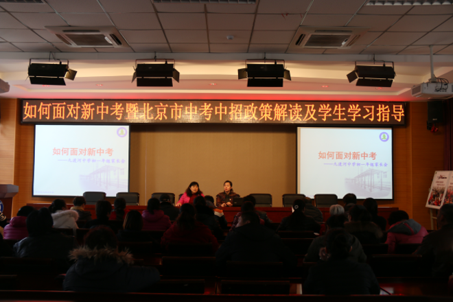 之后,家长朋友们汇聚一起在多功能厅进行家长培训。首先,教务处宋主任就“如何面对新中考——暨北京市中考中招政策解读及学生学习指导”向初一家长朋友们详细解读了中考中招政策,并就初中的具体学习方法进行了学法指导;之后,又向初三家长们进行了“期中考试之后——我该怎么办”的精彩讲座。家长们均感触颇深,纷纷表示要从初一开始抓起,积极配合学校老师,共同促进孩子的学习。然后,李城老师向家长们做了关于“健康促进学校”理论知识的培训,重点就预防近视、控肥胖、控烟等相关方面进行介绍讲解,进一步提升了家长的健康意识和相关知识。接下来,政教处白春梅主任就“帮助孩子养成好习惯”进行初一年级家长培训,并就孩子升入初中后家校联手做好对孩子的管理和教育等方面做了辅导。白主任恳切的言辞、慷慨激昂的演讲获得了家长们的一致肯定及积极响应,纷纷表示要与学校老师一起联手规范孩子的学习和生活习惯。最后,白主任就“初一学生综合素质评价”和创建“北京市食品安全示范区”向家长朋友们进行了解读和培训。