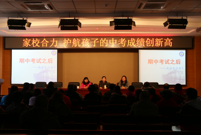 与此同时,各年级的家长会也在如火如荼的进行着,各位班主任对这次家长会做了充分的准备。在这次家长会中,他们向家长朋友们展示了孩子们在校上课、体育运动会、参加社会大课堂等活动中的精彩表现,有的班级对在各方面表现优秀的学生及家长进行了表彰,有的班级组织家长和学生共同制定学习目标,各位任课教师也同家长就孩子的在校上课情况做了交流。其中,初二年级借此家长会还开展了“感恩教育”,通过给父母读一封信或者最想对父母说的几句话又或者给父母一个拥抱,让孩子们知道在自己成长的过程中有多少人付出了努力和关爱,从而学会感恩,进而用实际行动表达自己的感恩之情。在此过程中,有很多令人动容的画面:孩子的啜泣、父母的眼泪和欣慰的笑容让我们也无比触动。同时,初三年级组长席雪莲老师就“家校合力,护航孩子的中考成绩创新高”向初三家长做了精彩的演讲。
