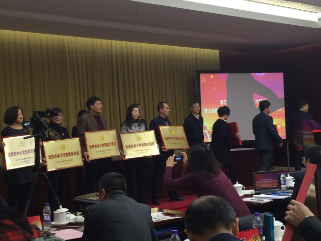 会议首先由市委教工委组织处处长李明辉宣读命名第三批北京市中小学示范点,并进行授牌。我区首师大附属红螺寺中学党总支、实验小学党总支获此殊荣。