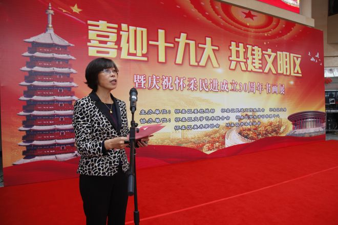 开幕式上,怀柔区学管中心主任李秀娥致辞。她说:“在党的十九大即将召开的日子,我们组织开展“喜迎十九大 共建文明区”笔会交流活动,对弘扬中华传统文化、传承书画翰墨精髓具有重要教育意义和纪念意义。”