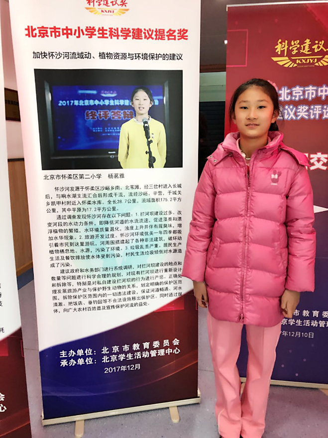 2017年12月10日,第九届北京市中小学生科学建议奖评选活动获奖项目交流会在北京市广渠门中学举行。我区第二小学喻佳俊老师辅导杨茗雅同学的《怀沙河流域动、植物资源与环境问题的调查与研究》项目,从近千名北京市中小学生提出的871项建议中脱颖而出。经过初赛进入30强,进入最后决赛,并最终获得北京市科学建议奖提名奖,同时我区被评为北京市科学建议奖优秀组织奖。